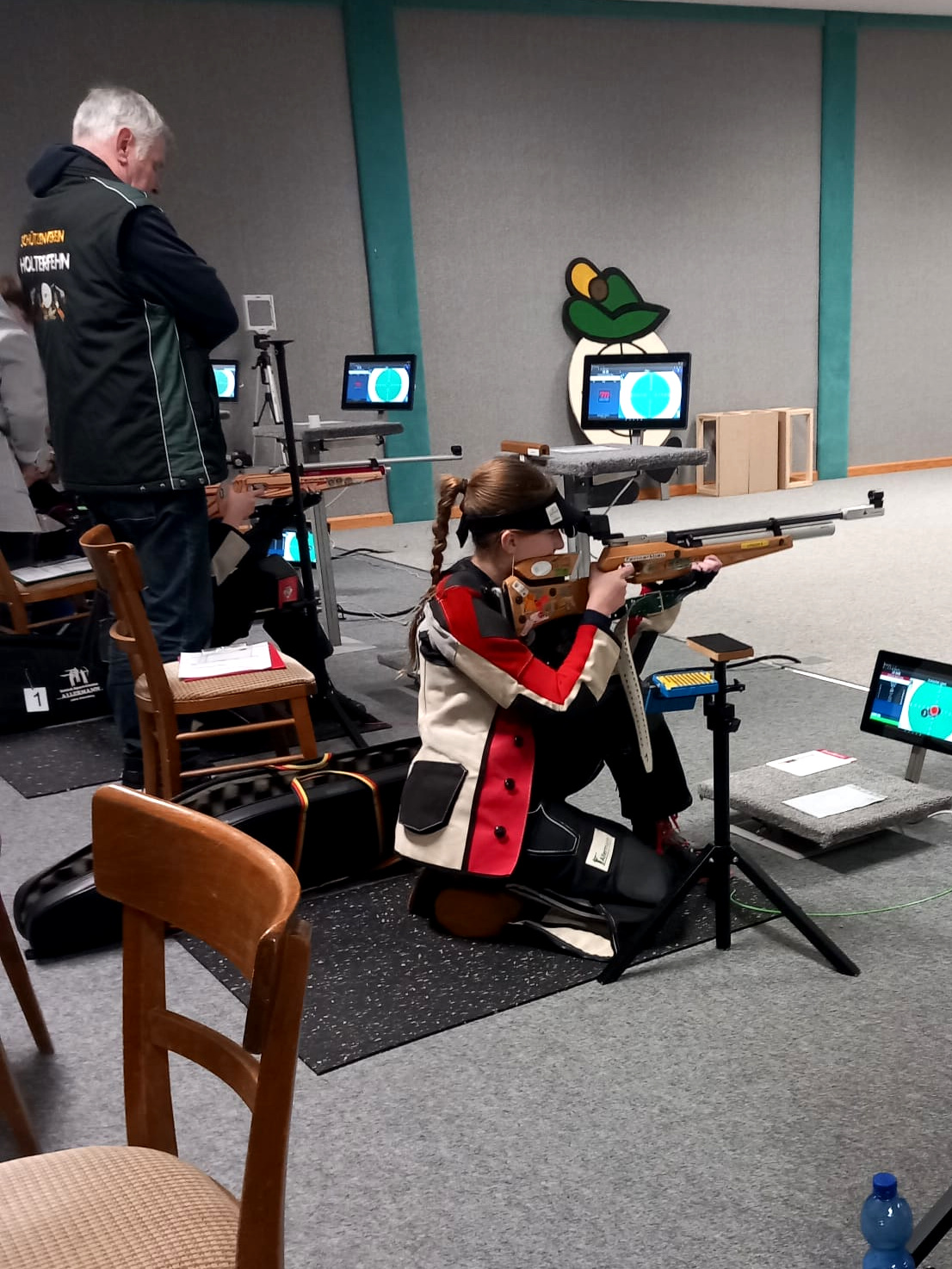 Laura Troitzschel 2024 im Kniendanschlag. Im Hintergrund gibt Wilfried Lühring Pia Kuhlmann Tipps. Foto: Pascal Troitzschel
